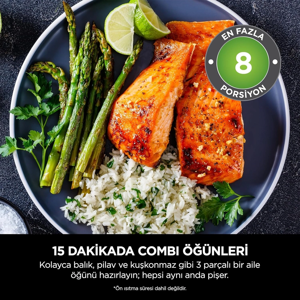 | وجبات عائلية في 15 دقيقة | تكفي حتى 8 أشخاص باستخدام وظيفة وجبات Combi يشمل مقلاة Combi، صينية خبز، لوح قرمشة، ودليل وصفات مع أفكار وصفات متنوعة. مناسب لتحضير وجبات متنوعة من الإفطار حتى العشاء باستخدام جهاز واحد. |