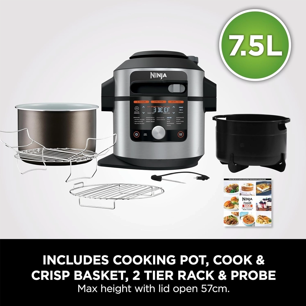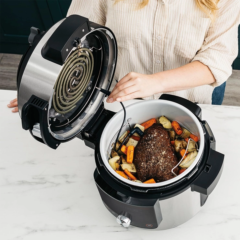 | طباخ متعدد الاستخدامات بغطاء ذكي، يجمع بين طنجرة ضغط كهربائية ومقلاة هوائية. | |
