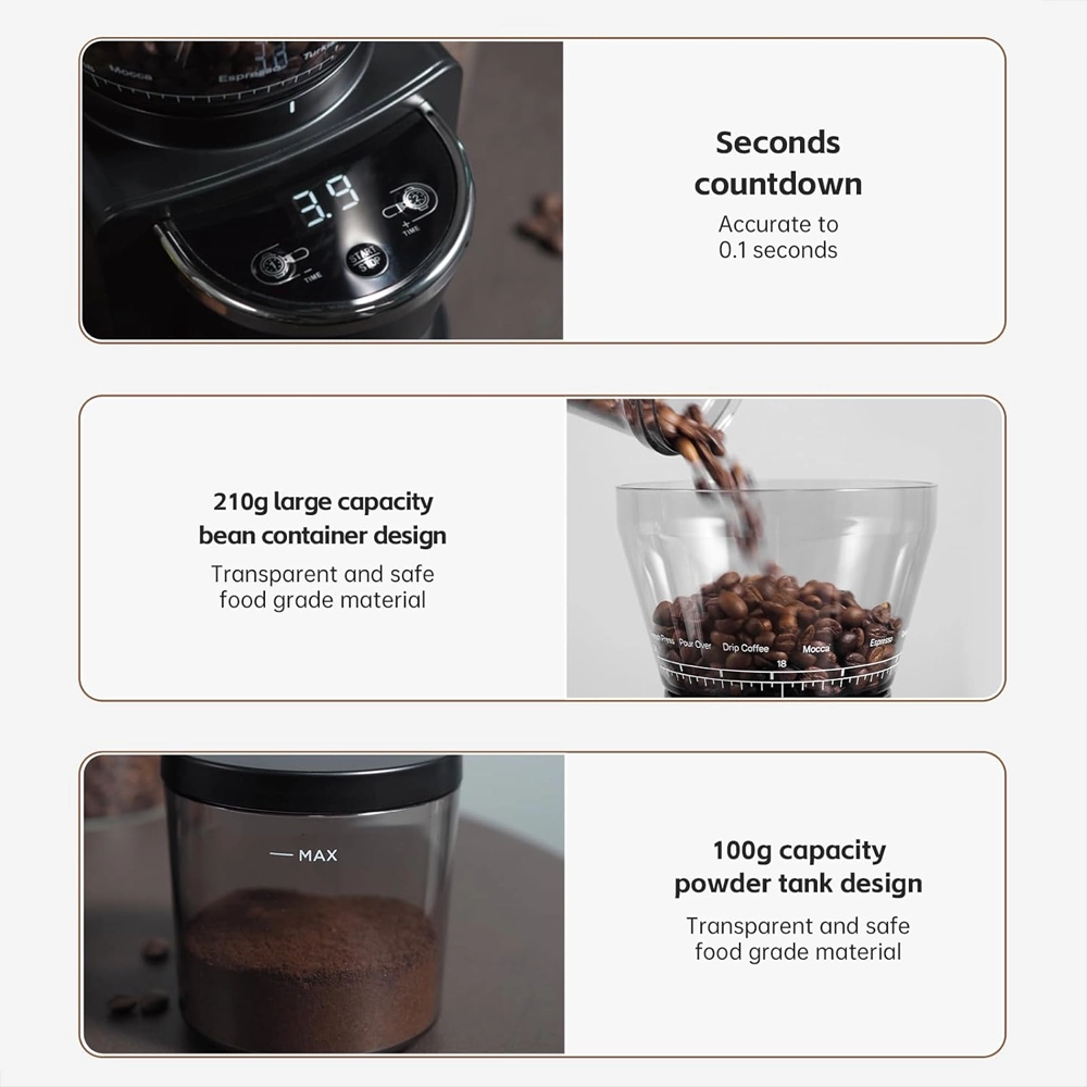 | - المميزات الرئيسية لمطحنة HIBREW G3 | - شفرات مخروطية عالية الدقة 40 مم تصميم احترافي يقلل الحرارة أثناء الطحن يحافظ على زيوت القهوة الأساسية |