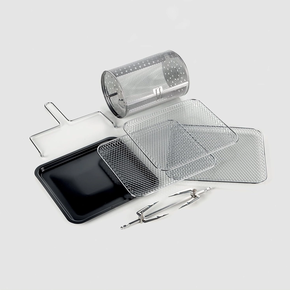 | مرفقات شاملة | 3 شوايات، صينية تحميص، سيخ دوّار، سلة دوّارة، ومقبض لإزالة السيخ بسهولة وأمان. |